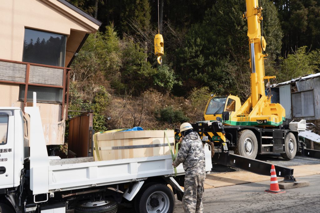 柏屋旅館の貸切露天風呂は、山手に設置されているので、とても長いアームのクレーン車で撤去&設置作業を行います。