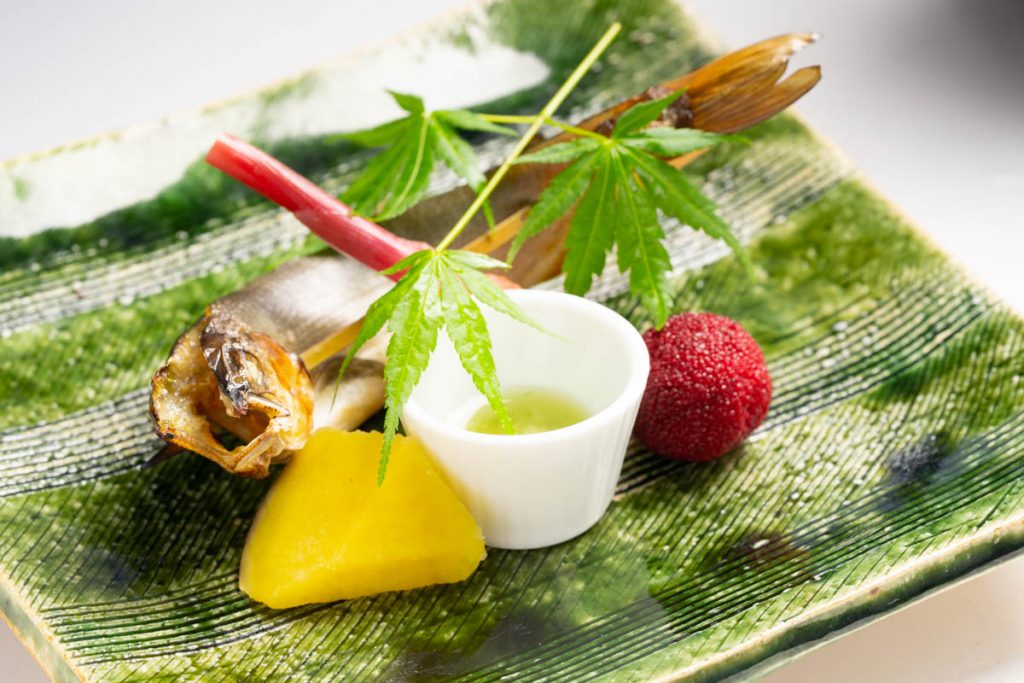 新緑の四万温泉を感じさせる、緑の食材や旬の食材に、いなか豚や県産野菜、地元高校の生徒が作ったトマト「甘しずく」などを組み合わせました。爽やかな新緑の季節を料理でも感じていただければ幸いです。