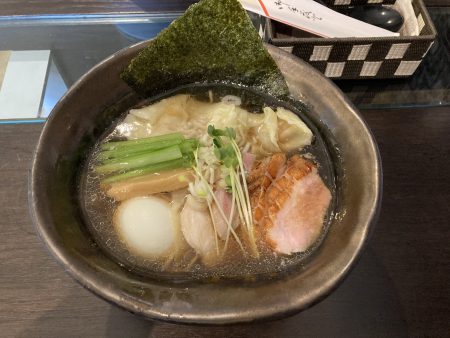鴨出汁醤油のワンタンメンに鴨肉追加+味玉を注文しました。(写真下手ですいません)