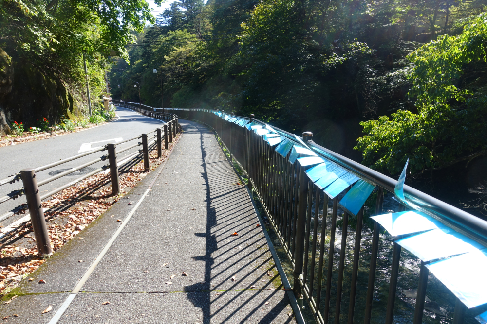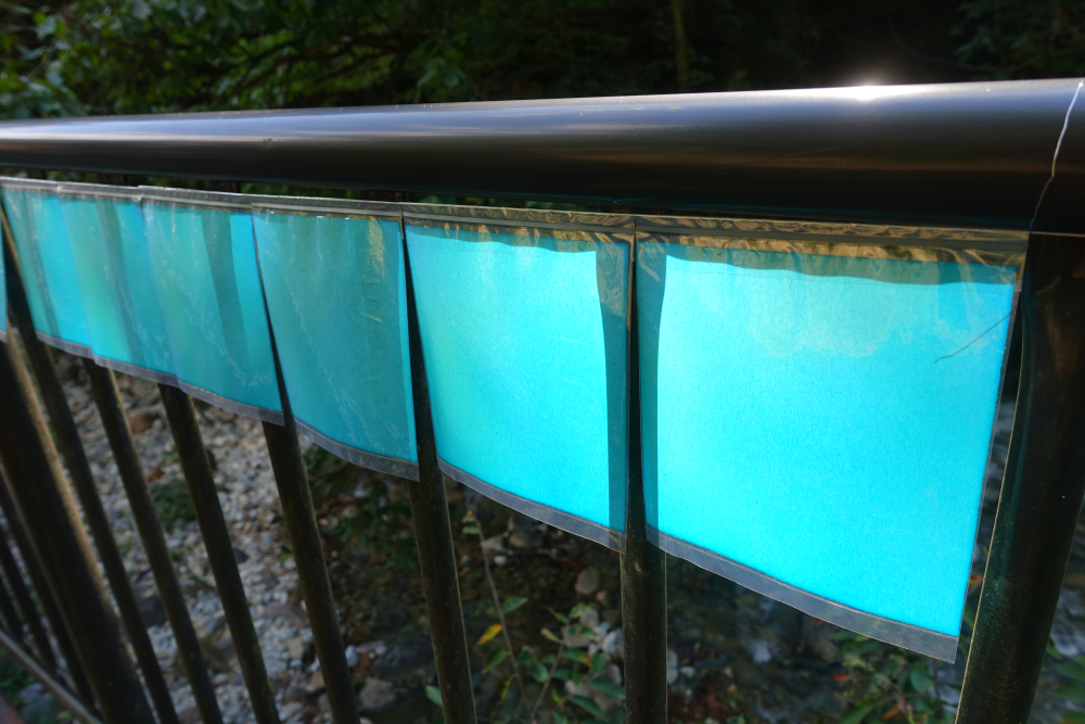最後尾まで進むと、作家の滝沢礼子さんご本人がいらっしゃいました。お話をきくとなんと朝の6時からずっと貼り続けているとのこと。(この時は午前11時です)この作品は急に展示を決めたそうで、なんとカタログにのっていないそうです。(※旧第三小学校の方の滝沢さんの作品は載っています。)作品の意味を聞くとシンプルで、凄く面白かったです。カタログにのらなくても、アートが溢れ出てきてしまうかのような、こんな方をアーティストっていうんだろうなって作業をする滝沢さんを見て思いました。作品の意味は書いてしまっては面白くなくなってしまうと思いましたので、是非ユーキを見つけたら聞いて下さい。この道を歩いて通ると作品を感じられるようになってます。