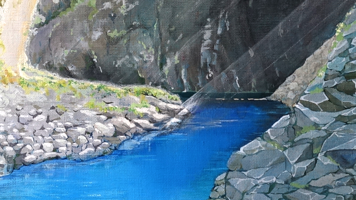 場所は「四万の甌穴群」です。写真に写すとなぜか毎回、水の色が青系強めになってしまうのですが、実際の原画は青緑を入れて四万ブルーを表現しています。柏屋旅館の2階に飾らせて頂いてます。通りかかった際にささやかに四万の自然をお届け出来れば幸いです。