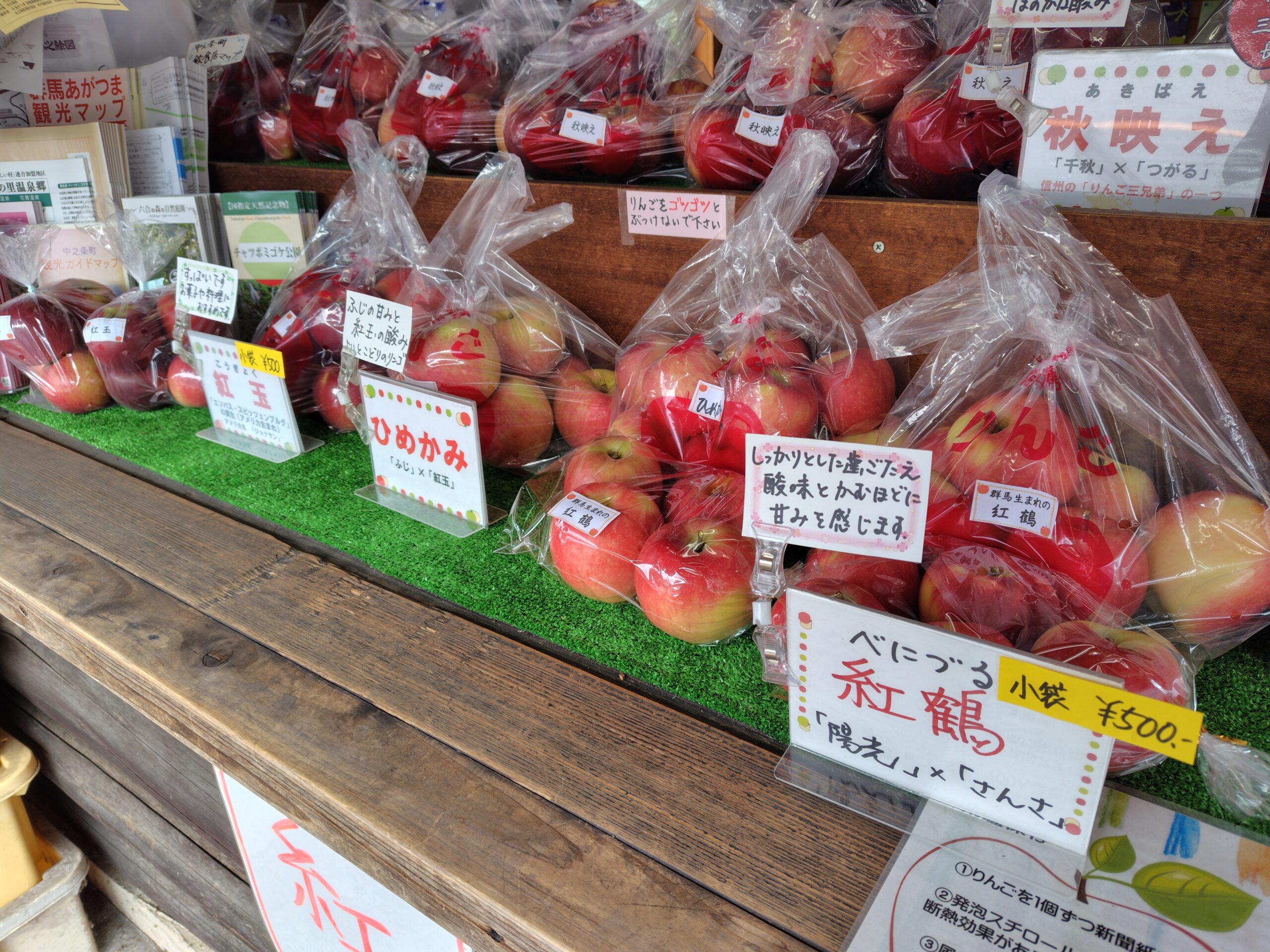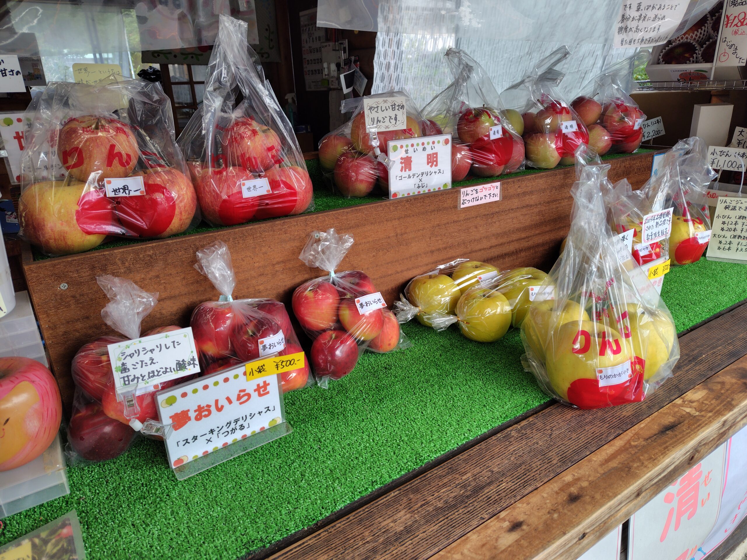 有名どころでは「秋映」や「紅玉」、ほかにも「ひめかみ」「清明」「もりのかがやき」など、たくさんの種類のりんごが並んでいます。