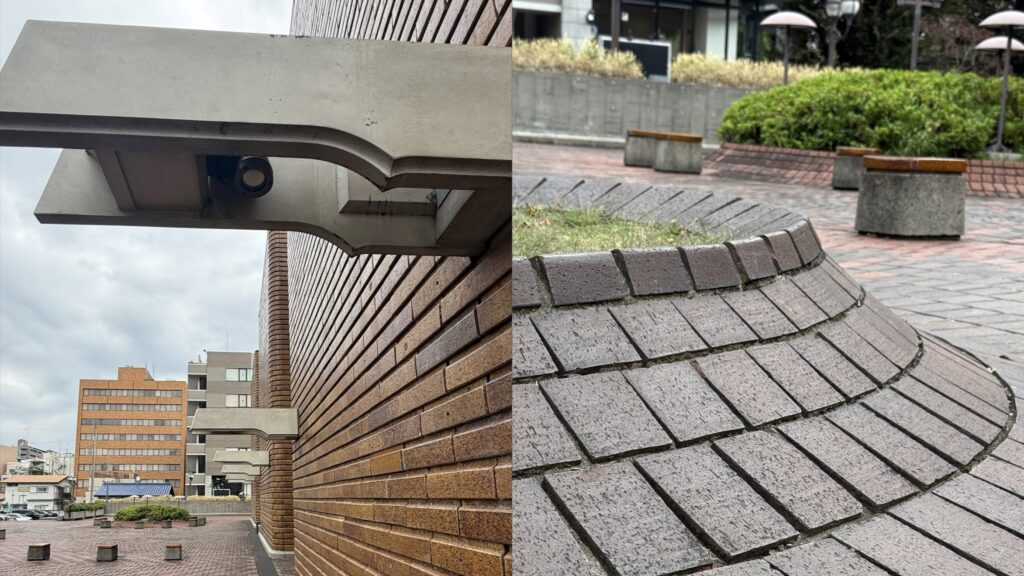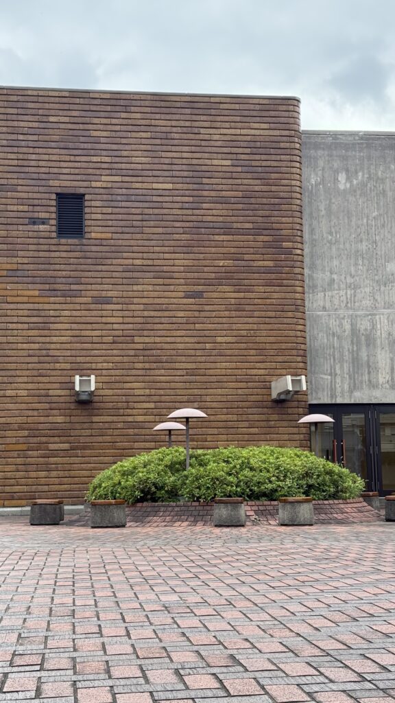 レンガを隆起させて形成した植木スペース。キノコのような傘の街灯。建物から水平に伸びる力強い照明。いいですよねぇ。