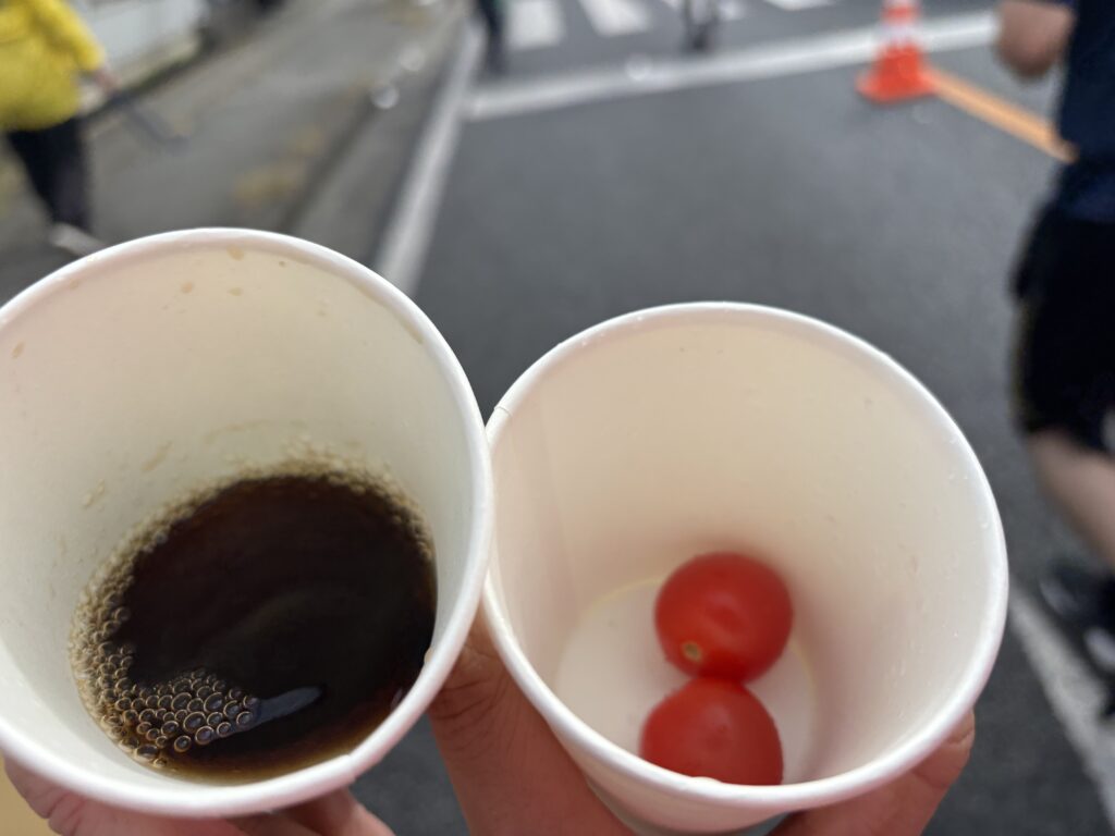 ミニトマトとコーラ!28キロ地点です。とってもエネルギーになりました🍅