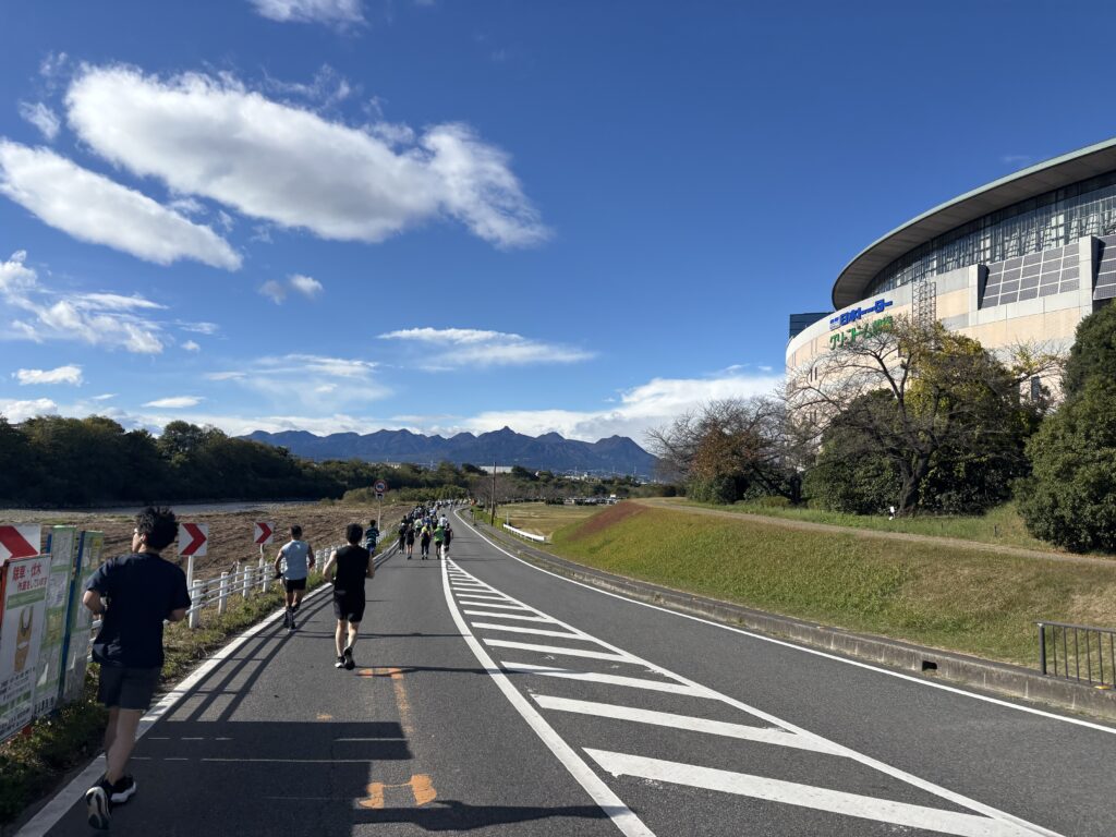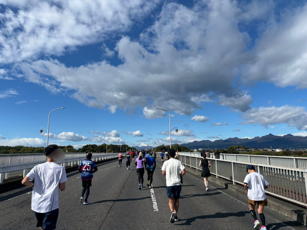 少し晴れてきました。ここで約10kmです!群馬の山々を眺めながら走るマラソンは最高でした。