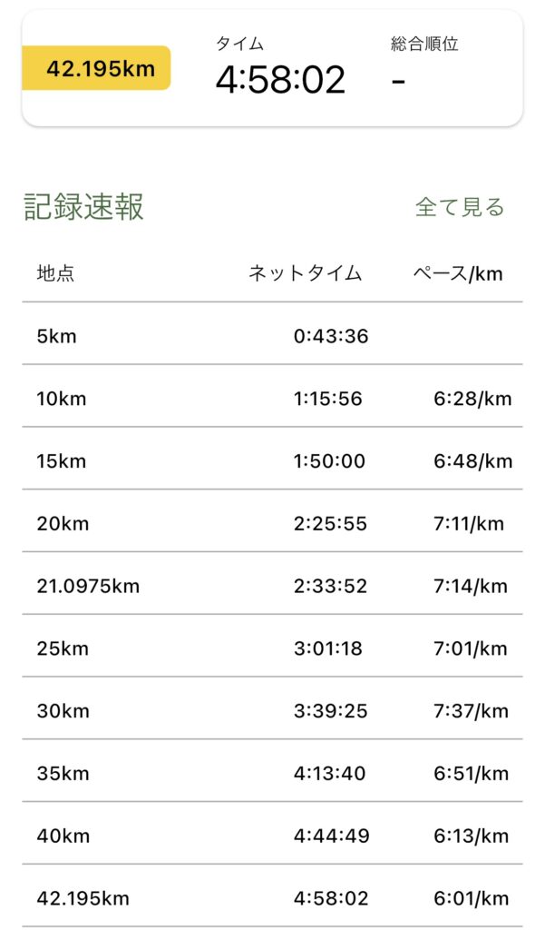 なんとか5時間を切ることができました。走りきった!という感じです。😭
