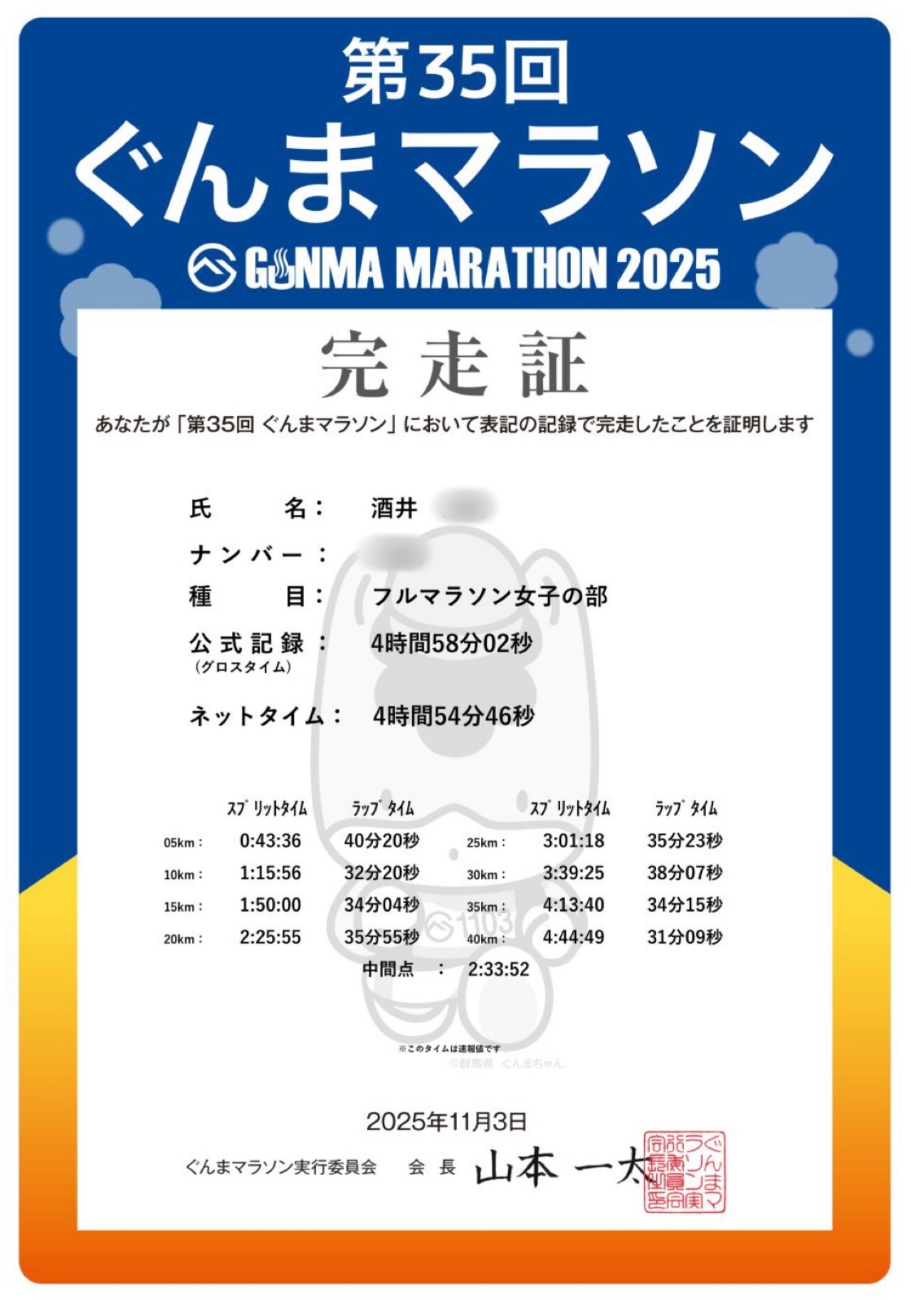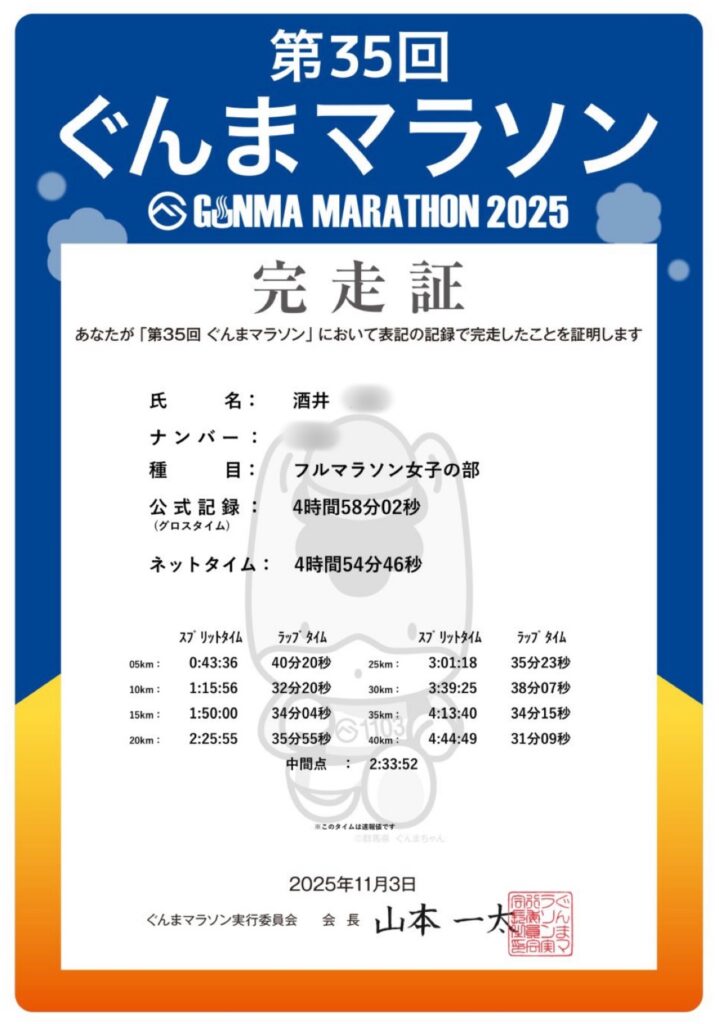 私事になりますが、11月3日(月)第35回ぐんまマラソンに出場してフルマラソンを完走しました!💨
