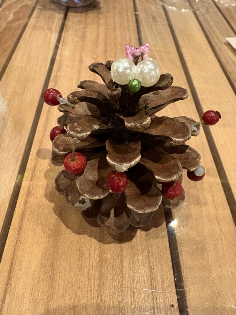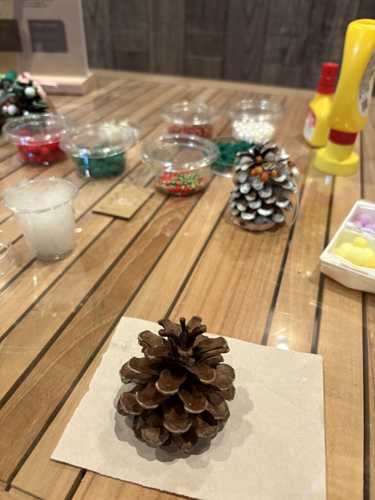 また、屋内ではアクティビティがいくつか開催されており、12/25までの冬季限定アクティビティの「松ぼっくりのクリスマスツリー」を作りました!