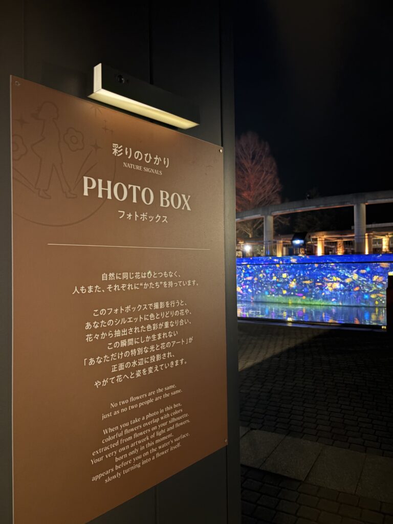 BOXの中で写真を撮るとその写真が後ろの水辺のアートに映し出され、花びらが舞っていて自然を味わうことができました。