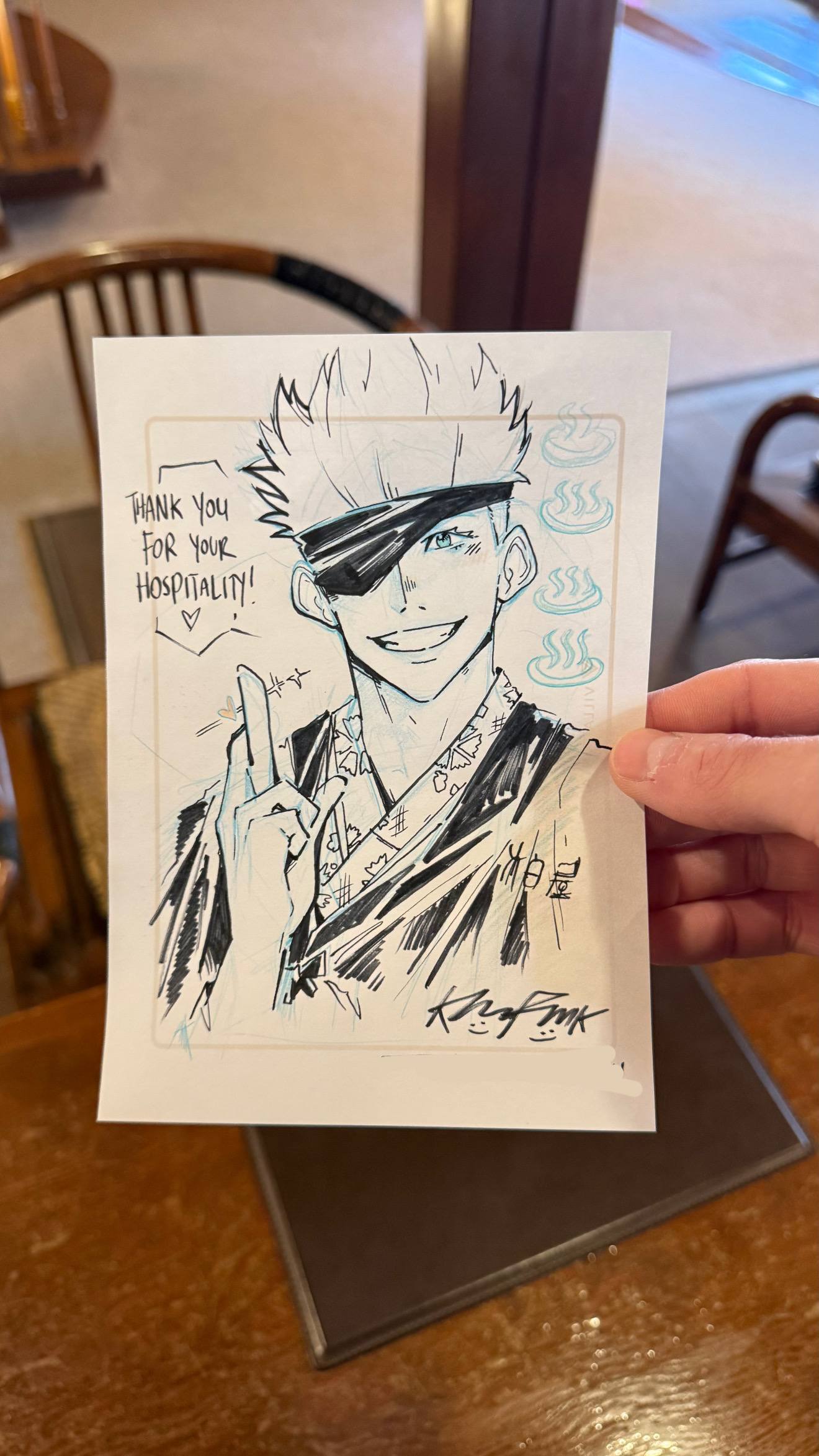 こちらは呪術廻戦に登場する最強キャラ、五条悟のイラスト。よく見ると柏屋の羽織を着ていますね!笑