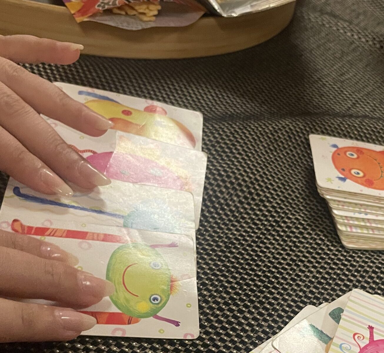 『タン』とか『ハン』とか『メン』とか書いてあるカードを場に出していき、中華料理の名前を作るゲーム。
