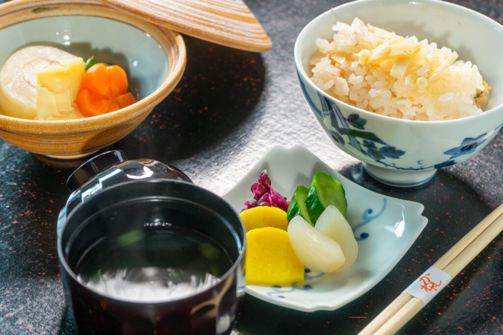 南部鉄器の鍋で炊きあげた たけのこ桜ご飯 あさり風味