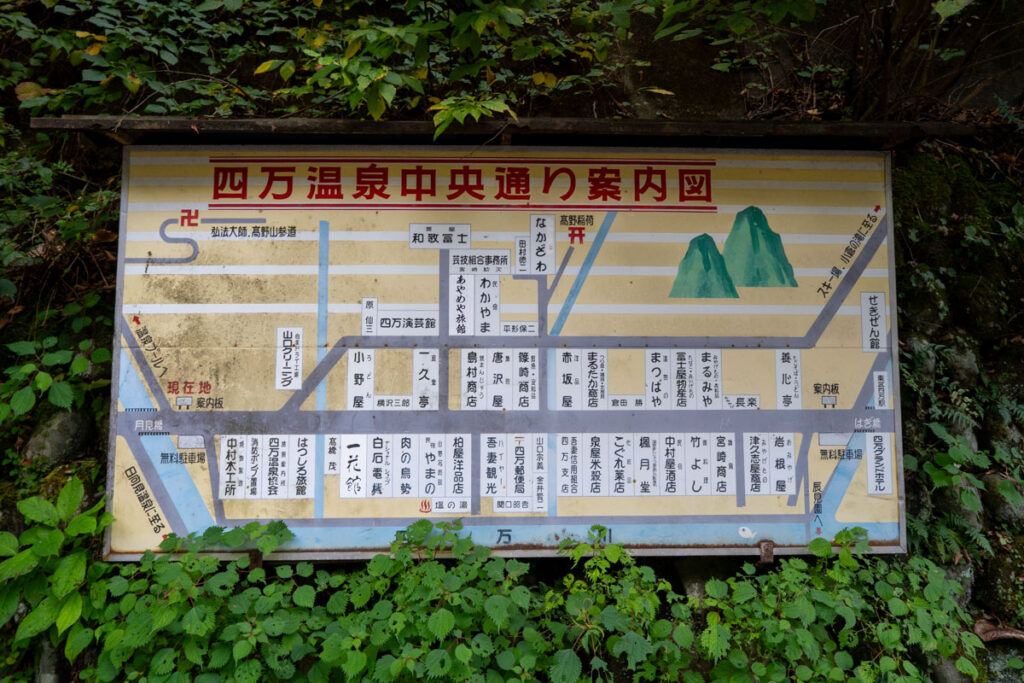 柏屋旅館から柏屋カフェ方面に向かう途中、桐の木平商店街の手前の月見橋バス停近くにひっそりと掲げられた「四万温泉中央通り案内図」という古〜い看板があります。
