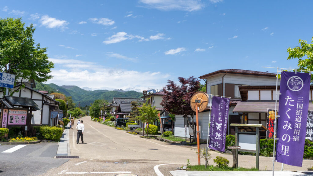 たくみの里は、須川宿趾に並んだ昔ながらの風景を残す町並みで、名前の通り、木工、陶芸、竹細工、和紙などの手作り体験や作品の展示販売できる「たくみの家」や飲食店が立ち並んだ町です。
